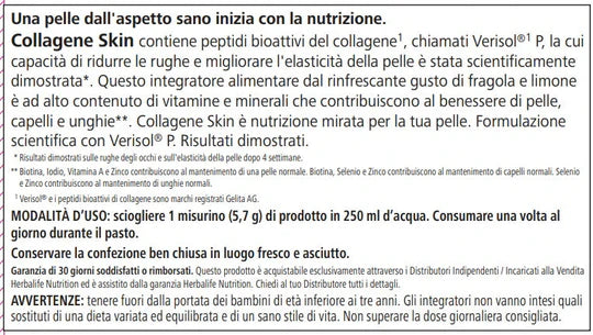 Prova il NUOVO Collagene Skin! Una bevanda di bellezza al gusto di fragola e limone, ad alto contenuto di vitamine e minerali che contribuiscono al benessere della pelle, capelli e unghie*. Contiene anche peptidi del collagene di alta qualità, chiamati Verisol® P, la cui capacità di migliorare l'elasticità della pelle e ridurre le rughe degli occhi dopo quattro settimane è stata scientificamente dimostrata**. Inoltre è stato dimostrato che Verisol® P riduce i segni visibili della cellulite dopo 3 mesi di uso regolare***.